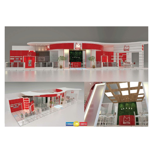 Nos stands construídos utilizamos madeira, vidro, bagum, placas de MDF, estruturas em ferro, dry wall, dentre outros materiais disponíveis no mercado. Para a construção de um stand desse tipo, utiliza-se tudo que não for estrutura modular.